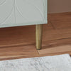 Les détails sculptés de la façade de ce buffet de rangement offrent une touche de luxe qui se marie parfaitement avec la finition vert pâle..