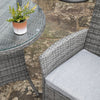 L’ensemble de jardin 2 places Laura James en rotin est parfait pour recevoir et dîner en extérieur. Cet ensemble est tout équipé et inclut deux chaises, une table et son plateau en verre ainsi que des coussins gris clair.